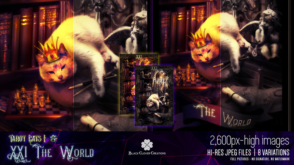 Included in the package are 2,600 x 1,637 px all 8 versions of the "Tarot Cats I - 21 The World" images without my artist signature nor watermark.